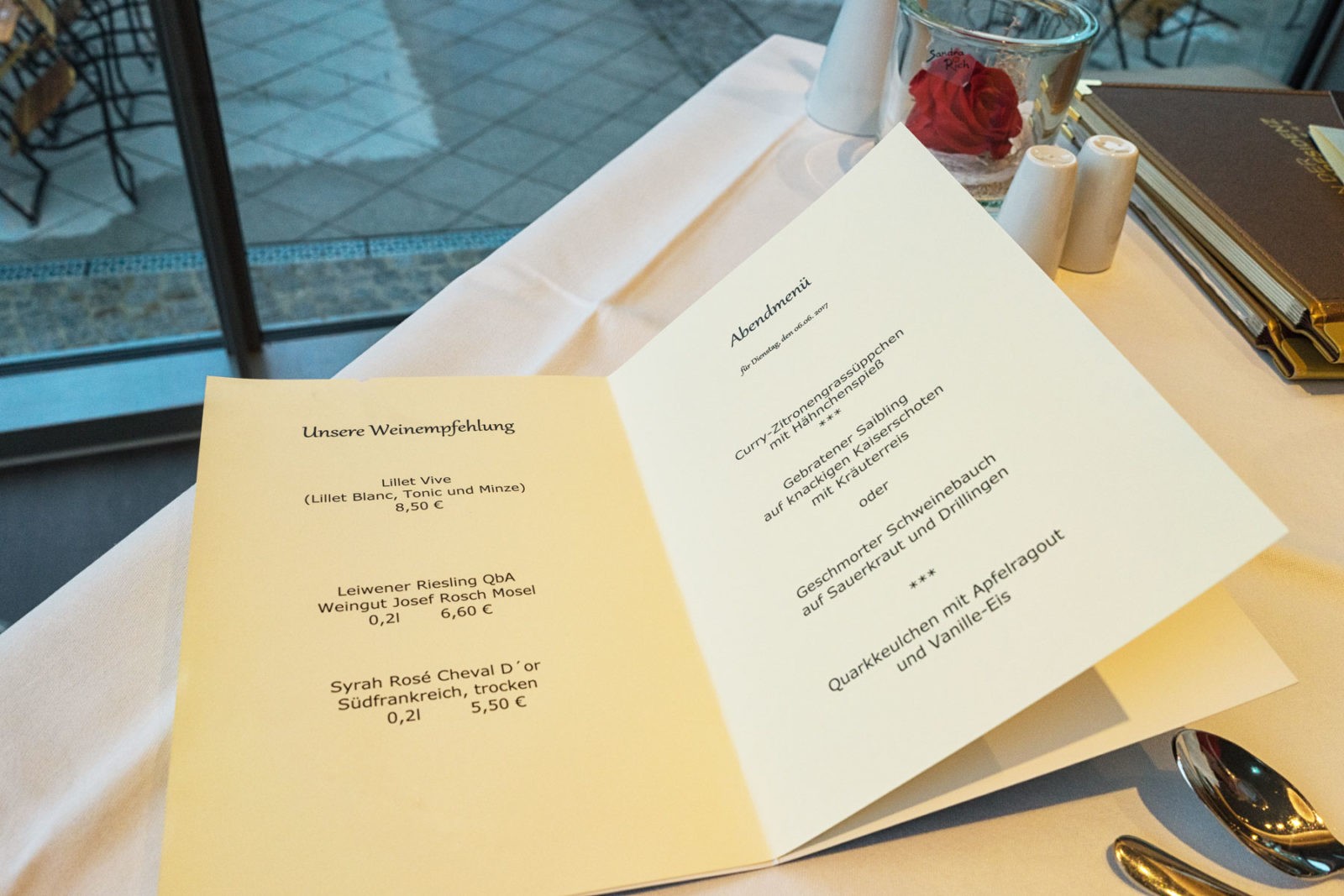Im Hotel-Restaurant Elbterrasse werden wir zu einem schönen Platz mit Ausblick auf die Elbpromenade gebeten. Kulinarisches Verwöhnen steht an. Bei unserer Halbpension werden wir jeden Abend aus zwei Hauptgängen auswählen. Obwohl mir oft nach Deftigem der Genusssinn steht, entscheide ich mich für den Saibling auf Kaiserschoten mit Kräuterreis statt des geschmorten Schweinebauchs. Elbe und Fisch vertragen sich sicher gut, und dazu gehört ein Moselwein aus Leiwen vom Weingut Rosch. Der darf meinen Gaumen schon beim Gruß aus der Küche umschmeicheln und erst recht beim Curry-Zitronengrassüppchen.