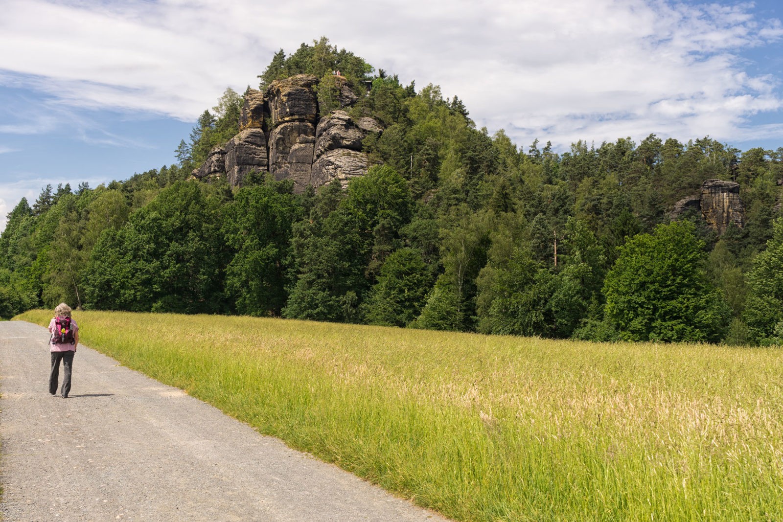 Auf den Punkt gebracht: Petra hat eine sehr ausgeprägte Höhenangst. Wie stark, führe ich nicht weiter aus, aber steile Pfade sind tabu, Stiegen gleichermaßen, und so weiter. Wir also rum um den Berg im seichten Gelände, hineingeschlüpft ins Wäldchen, das sich hinauf streckt in die Wand. Die weich modellierten Felsen am Berg kleben wie hingeworfen von riesigen Gestalten, die im Winter wohl Schneeball spielten, im Sommer dann aber in Ermangelung des kalten Zeugs kurzerhand Felsball. Das sieht schonmal gut aus, und wird noch guter, als ich mich – wie gesagt – von Petra trenne. Sie hockt sich hin an einer Weggabelung und ermahnt mich noch, nur schön auf mich aufzupassen. Ich habe doch den Autoschlüssel bei mir.