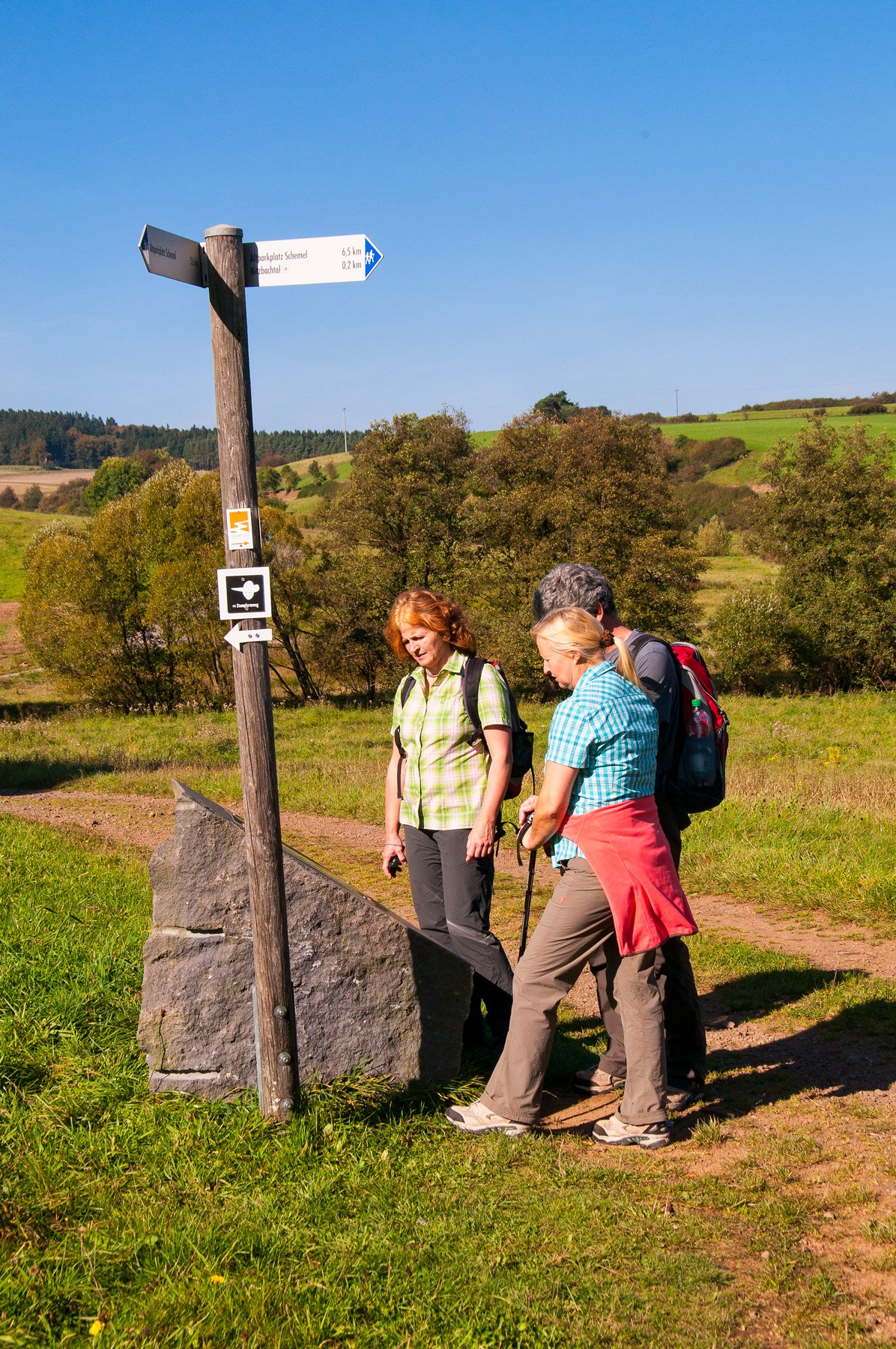Wer Wanderungen in der Eifel mit vielen Anstiegen verbindet, wird auf diesem Traumpfad erfahren, wie sanft es auch bergauf und bergab gehen kann. Für die Booser Doppelmaartour müssten wir im Grunde keinen Proviant, nur Getränke mitnehmen, aber viel zu gern nehmen wir doch die Angebote an Rastmöglichkeiten an, die uns auf dieser Rundwanderung erwarten. Sie startet an der Vulkanparkstation Booser Doppelmaartour, von der aus wir ein kurzes Stück bis zum Altparkplatz Schemel, dem eigentlichen Startpunkt, zurücklegen.