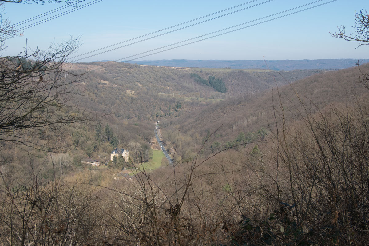 Nun nähern wir uns durch Laubwald und entlang von Wiesen der anderen Hangseite, passieren eine Schutzhütte und wenden uns rund 50 Meter danach rechts auf einen sich verjüngenden Weg, der uns dicht an den Bäumen entlangführt. Nach 100 Metern erwartet uns die Schöne Aussicht ins Brohltal und bis hinauf zur Burgruine Olbrück.