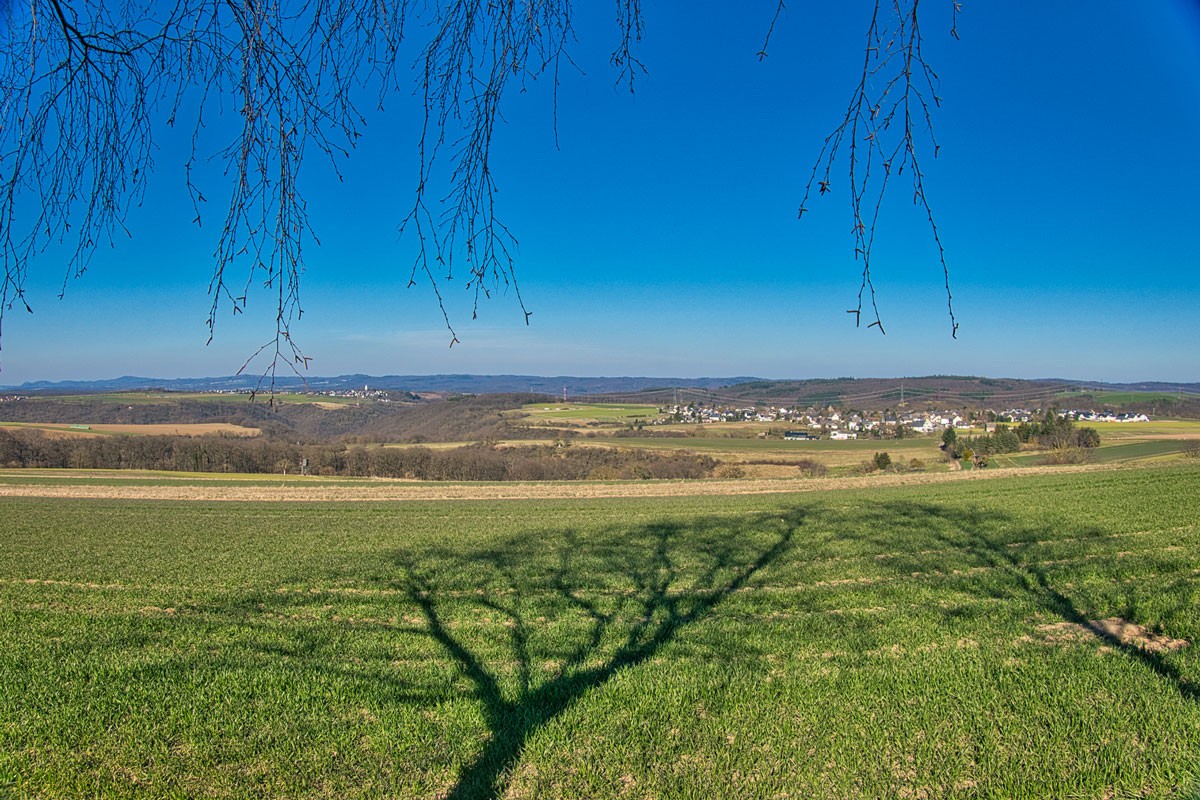 Wir lassen einen jungen Birkenwald hinter uns und belohnen uns nun selbst für die kurze Mühsal mit einem Blick über die weit offene Felderlandschaft. Während wir fast wehmütig weiterwandern, gleitet unser Blick über die Höhen. Doch halt, noch einmal halten wir inne, um am Aussichtspunkt Siebengebirge den vielversprechenden Namen auf seinen Wahrheitsgehalt hin zu überprüfen. Und wirklich, bei guter Witterung schälen sich weit entfernt die Umrisse der Berge am Rhein heraus.