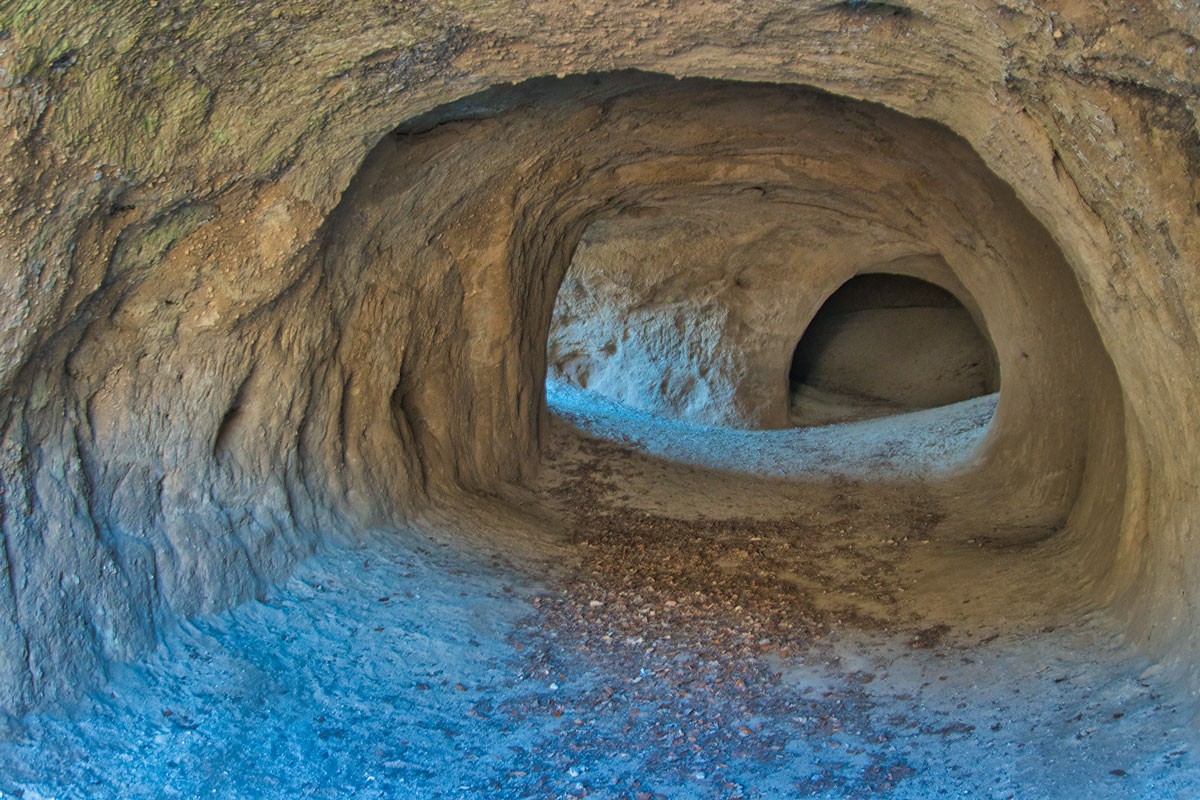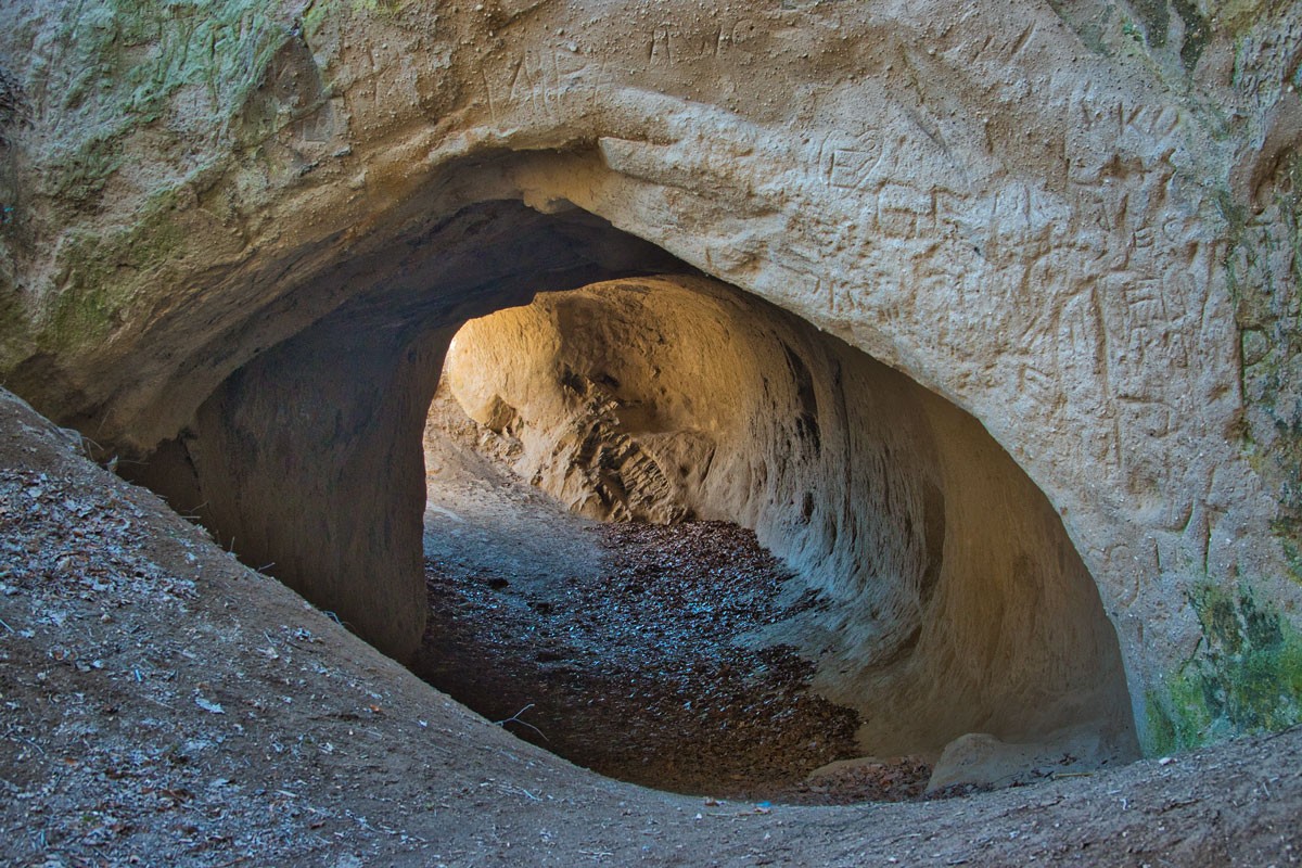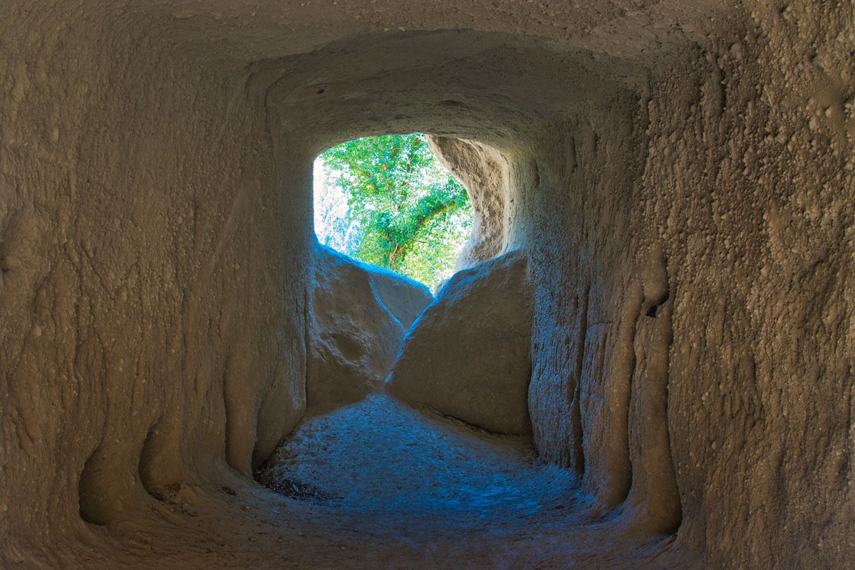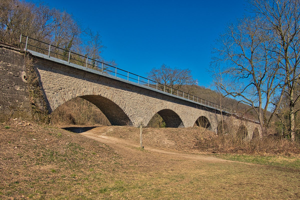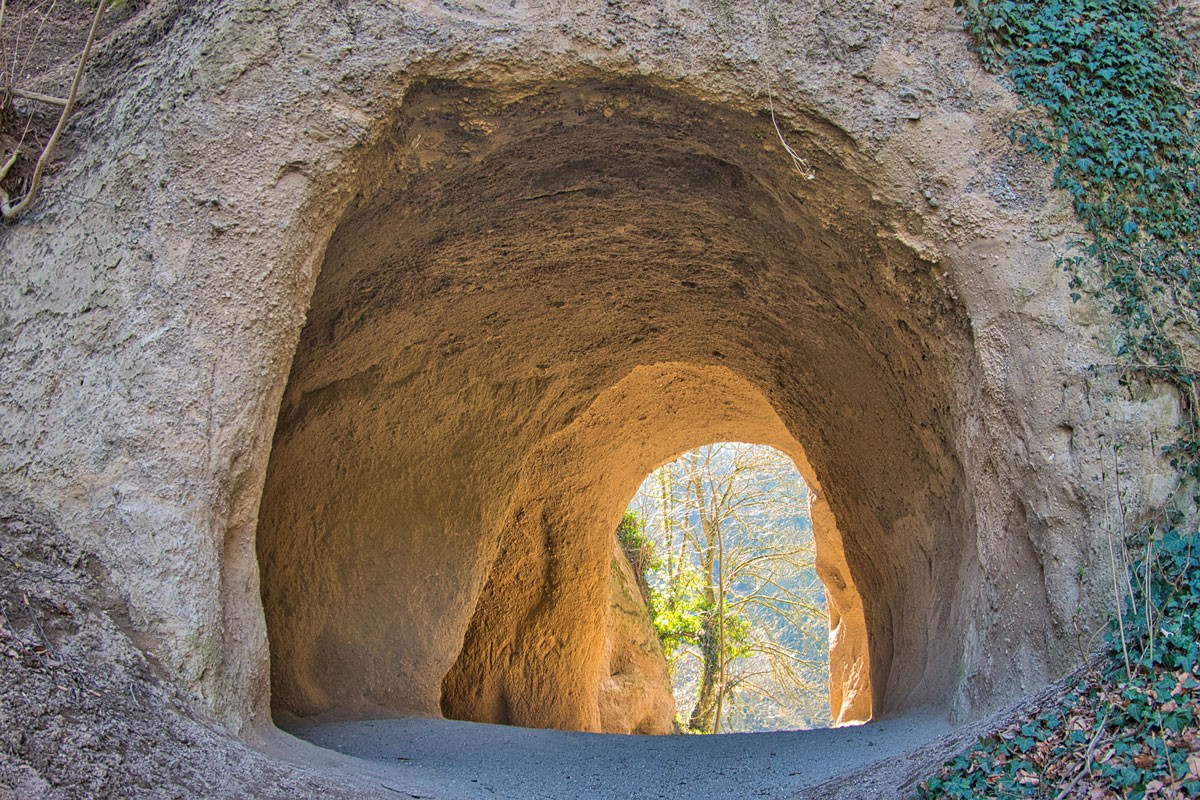 Wir überqueren die Brücke über den Brohlbach und dann die B 412, laufen unter dem wuchtigen Viadukt der Brohltalbahn hindurch und gelangen über eine Wiese zum Ensemble der Trasshöhlen, von denen wir einige durchlaufen. Diese vulkanischen Ablagerungen wurden bis ins 20. Jahrhundert in den Trassmühlen – so beispielsweise in der Mosenmühle bei der Schweppenburg – zermahlen und als Bestandteil von Mörtel verwendet.