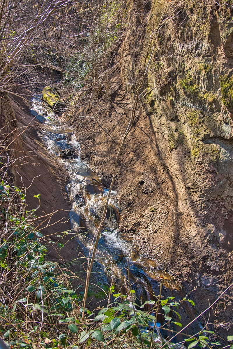 Nach knapp 200 Metern erreichen wir wieder die L 113, wenden uns aber sofort nach rechts in die Wolfsschlucht. Auf schmalem Pfad wandern wir die malerische Schlucht hinauf bis zum Wasserfall. Vor 13.000 Jahren ergossen sich vulkanische Ströme in die Schlucht und füllten sie mit Schlamm, in der im Lauf der Jahrtausende das Wasser ihr neues Bett schufen.