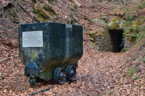 Einem quer verlaufenden Wirtschaftsweg folgen wir links, queren wieder den Fockenbach und verlassen sofort danach Hauptweg nach rechts. Nach etwa 200 Metern erreichen wir die Grube Louise (5). Der Zutritt in das Bergwerk bleibt uns verwehrt, sodass wir uns mit einem Blick durch das Gittertor in den finsteren Gang zufriedengeben.